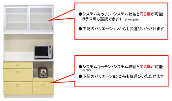 (1)システムキッチンやシステム収納と同じ扉で一体感を! 当社だからできる事!! 竣工後6ヶ月以内にご注文いただければ、すぐそばにあるシステムキッチン、またはシステム収納と 同じ扉での設置が可能!(※1) (※2) お客様のシステム収納(クローゼット・収納など)を、設計・施工している当社だからできる事!! しかも金額はそのままで!(※3)